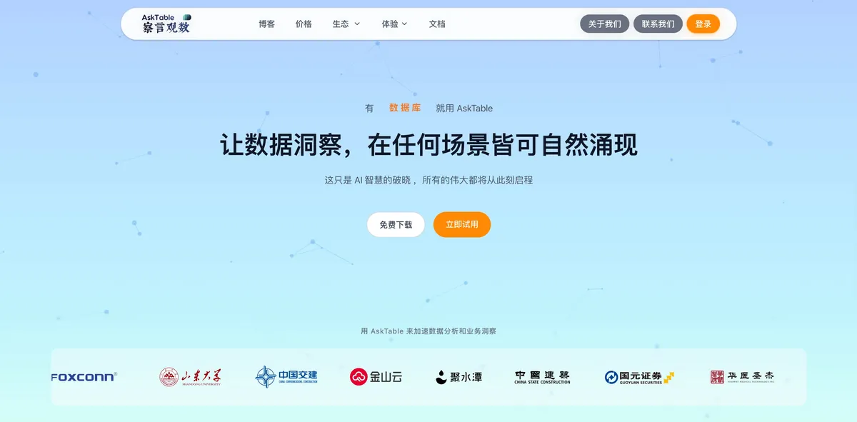 察言观数 AskTable - 察言观数(AskTable.com)致力于利用 AI 技术与交互创新,让数据洞察和决策,在任何场景皆可自然涌现。 - 初创.work