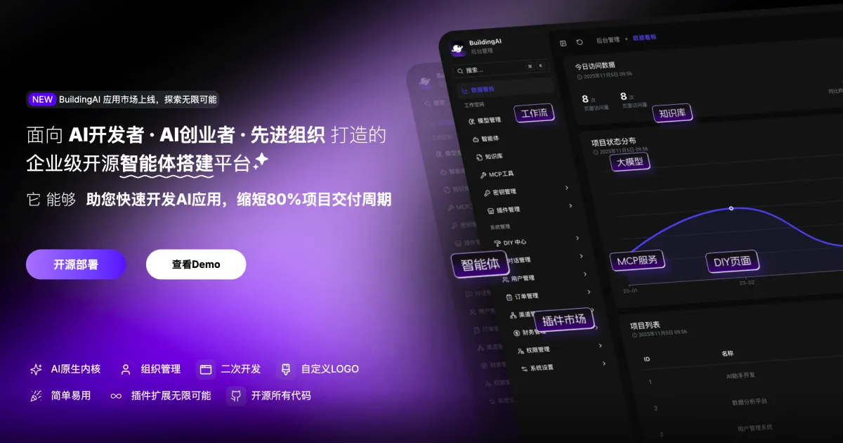 BuildingAI 是一款面向 AI 开发者、AI 创业者和先进组织打造的企业级开源智能体搭建平台。