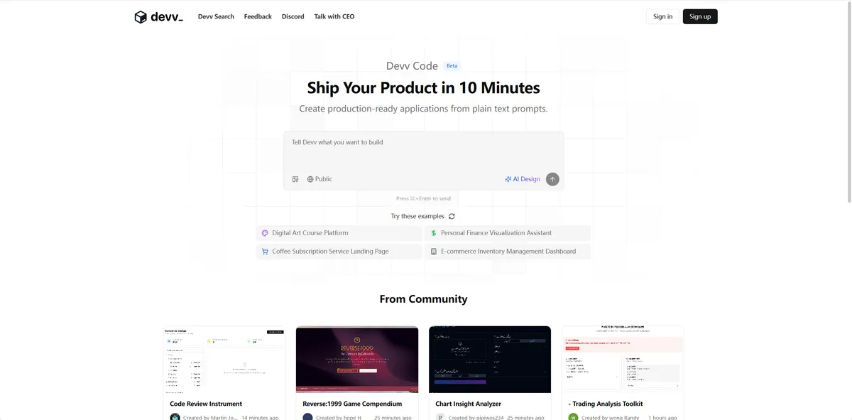 Devv - Devv Code 面向开发者的 AI 辅助开发工具,快速构建应用程序原型,支持 AI Design 辅助设计。 - 初创.work