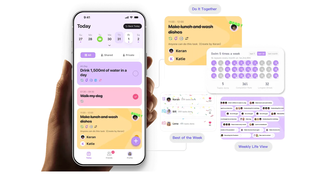 个人日常规划/朋友目标打卡/小组作业提醒/家务劳动分配,DuoDo都可以。