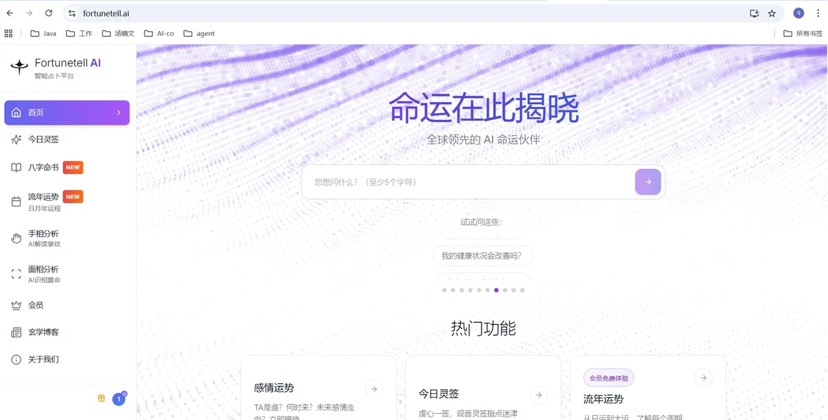 进入 Fortunetell AI,开启你与天地感应、与未来对话的旅程 —— 探索你的流年,规划你的生活。