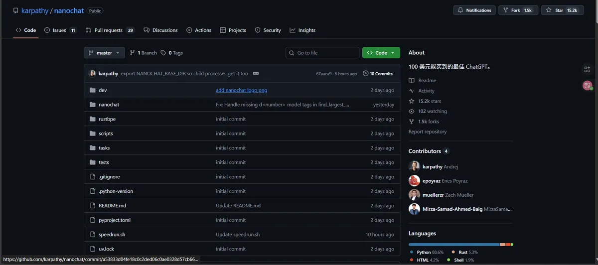 Nanochat - 从 0 构建 ChatGPT 的开源项目。 - 初创.work