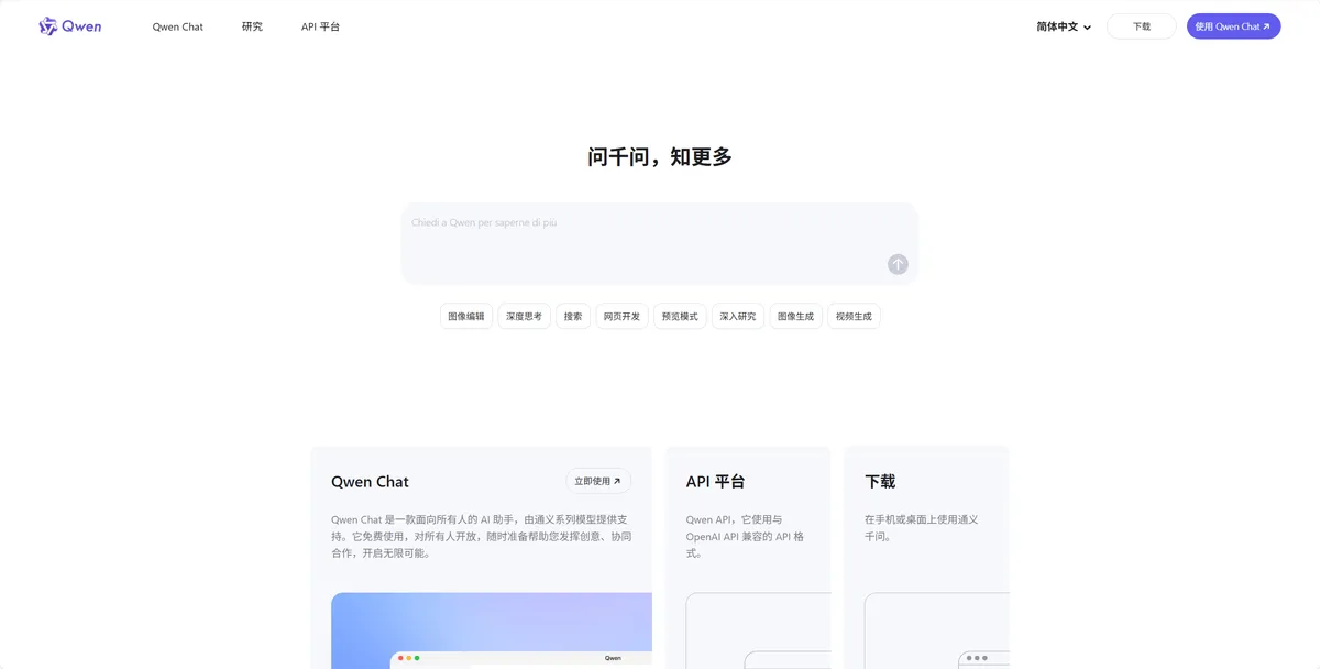 Qwen Chat 是一款面向所有人的 AI 助手,由通义系列模型提供支持。