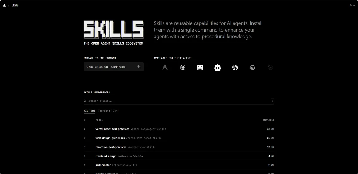 Skills - Vercel 推出的 Skills 排行站,根据 24h 热度进行排名。 - 初创.work