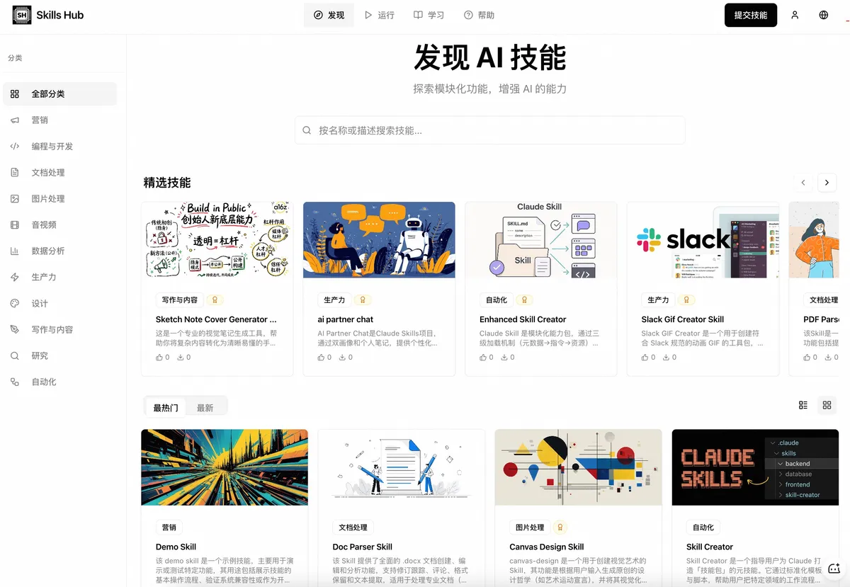 Skills Hub - 一个社区驱动的 AI 技能库,通过发现、创建、学习和分享,快速搭建你的 AI 脚手架。 - 初创.work