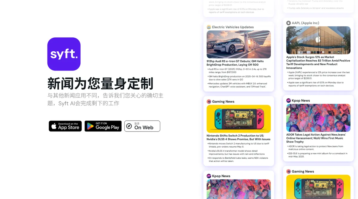 我们是 Dola AI 背后的团队,目前服务着近 300 万用户。这次我们要向大家介绍 Syft AI!我们是一群生产力黑客、新闻迷、技术宅和终身学习者,对传统新闻应用”一刀切却谁都不适合”的方式感到厌倦。